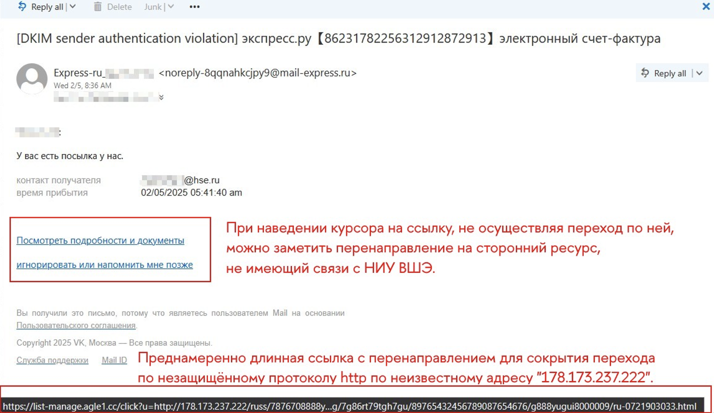 - Переслать на почтовый ящик antispam@hse.ru